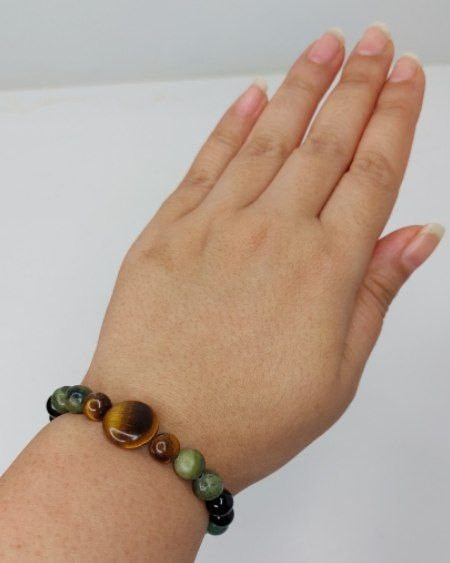 این دستبند مناسب برای کوا ی 3 و 4 شامل سنگهای چشم ببر،یشم ،عقیق سیاه واونتورین سبز است.