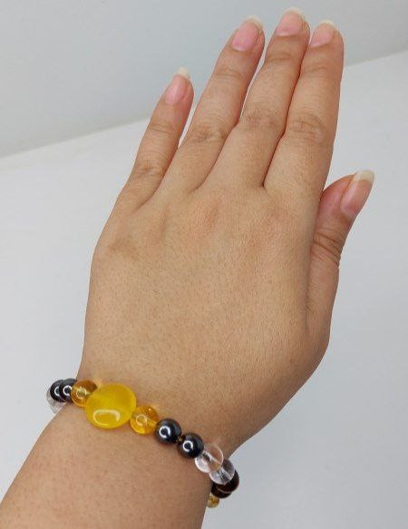 این دستبند مناسب برای کوا ی 6 و 7 شامل سنگهای عقیق زرد،حدید،کریستال کوارتز، چشم ببر و سیترین است.