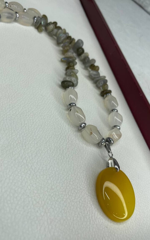 گردنبند فلز کوانامبر 6 و 7 ترکیبی از سنگهای لابرادوریت رنگین کمانی و عقیق
