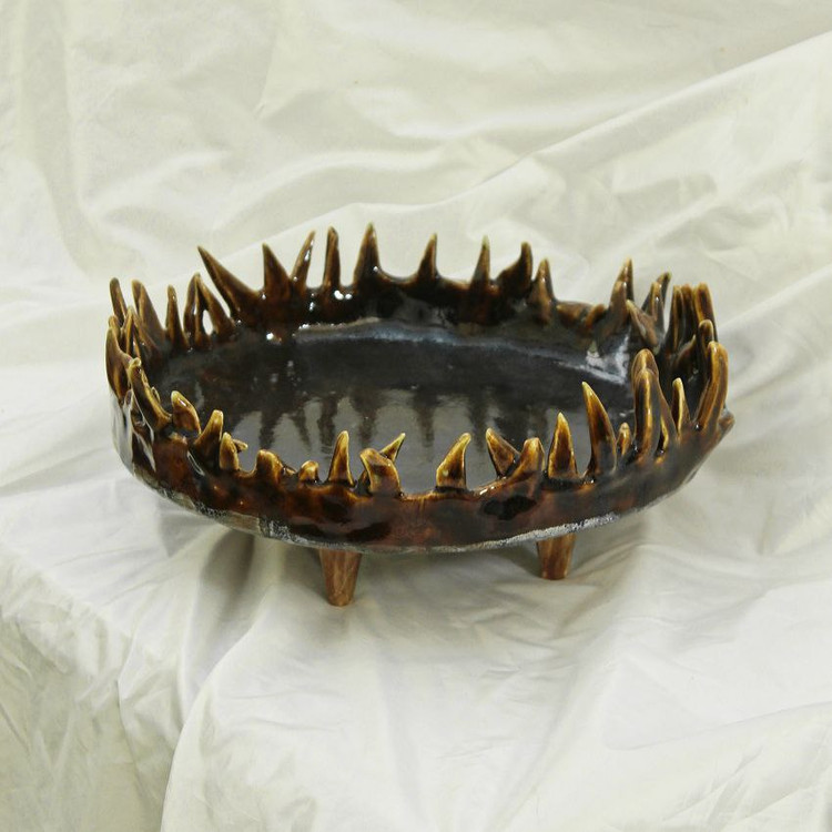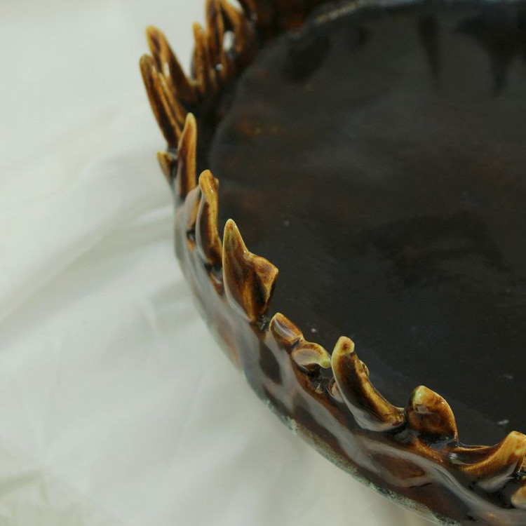 دستساز، جنس سرامیک، بدون سرب، قابل شست و شو، سبک و مقاوم، رنگ قهوهای تیره با رگههای سورمهای درخشان