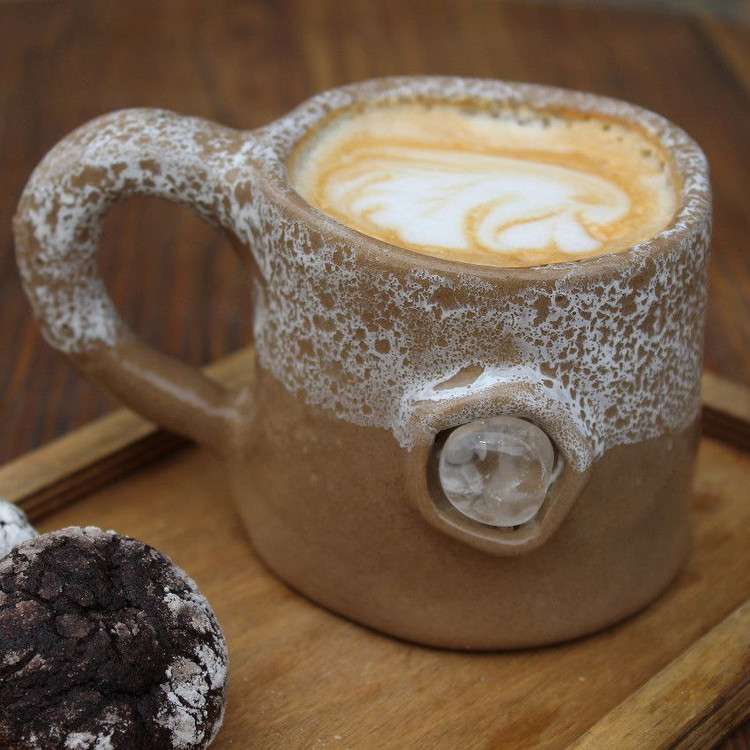 دستساز، جنس سرامیک، بدون سرب، قابل شست و شو، مقاوم، در بدنهی این ماگ سنگ کریستال کوارتز کار شده است. این سنگ چاکرای هفتم را تنظیم میکند وتابش دهنده و منعکس کننده نور و انرژی روحانی به سمت بدن است.