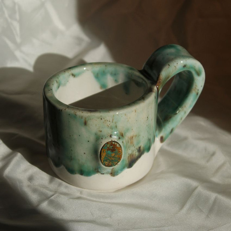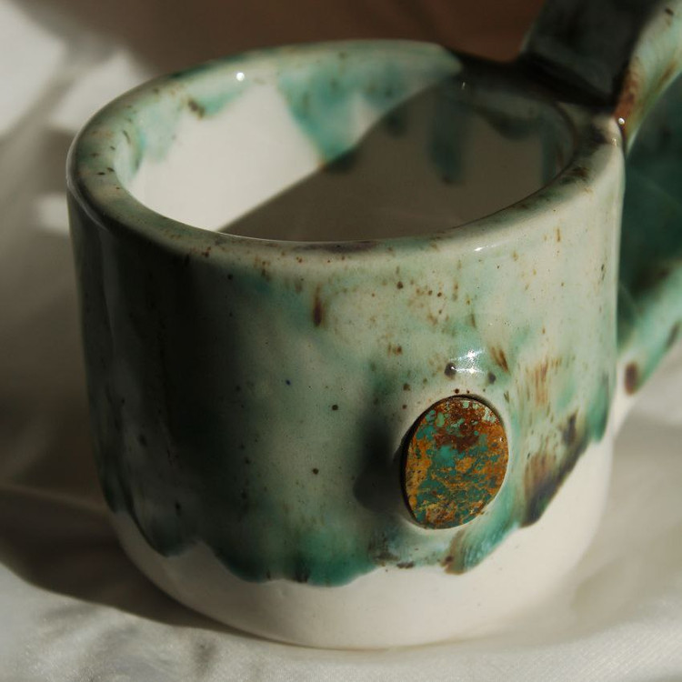 دستساز، جنس سرامیک، بدون سرب، قابل شست و شو، سبک و مقاوم، در بدنهی این ماگ نگین قیمتیِ فیروزه کار شده.