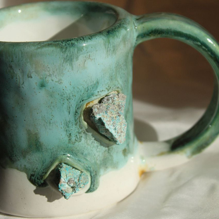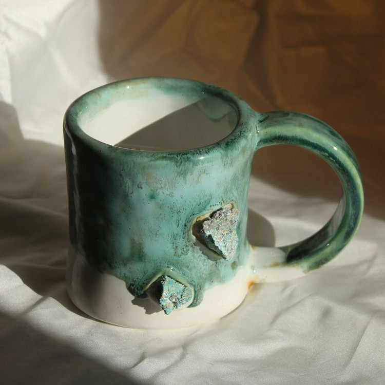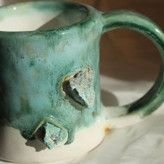 دستساز، جنس سرامیک، بدون سرب، قابل شست و شو، مقاوم، در بدنهی این ماگ سنگ قیمتی فیروزه کار شده