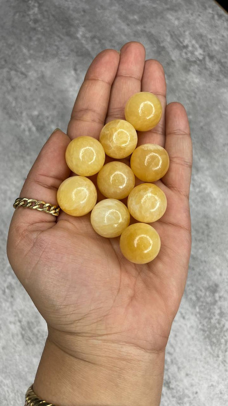این گوی درخشان با قطر تقریبی ۱۵ میلیمتر و وزن حدود ۱۰ تا ۱۲ گرم، از جنس کلسیت زرد طبیعی تهیه شده و با رنگ گرم و شاداب خود، انرژی و طراوت را به فضا میآورد. بافت لطیف و درخشش ملایم آن، زیبایی خاصی به دکورهای مینیمال و مدرن میبخشد.