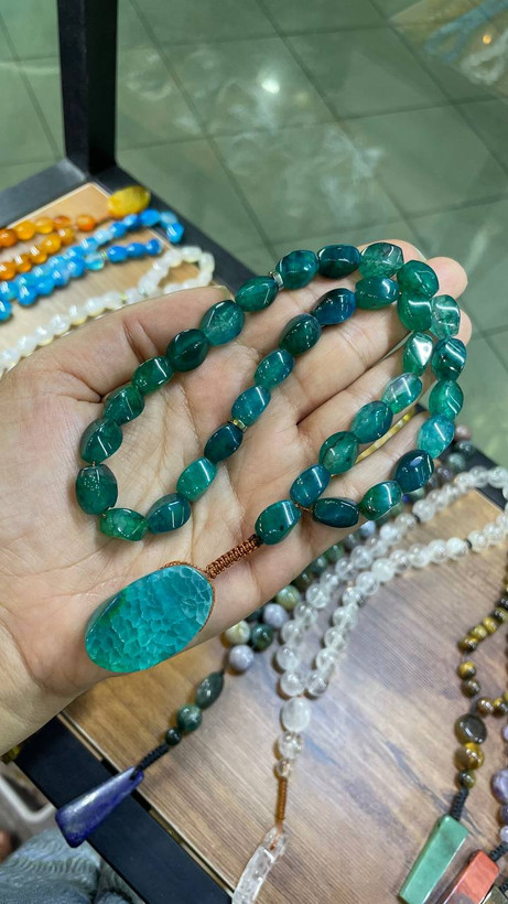 این تسبیح شامل ۳۳ مهرهی استوانهای و پیچی از سنگ طبیعی عقیق سبز است که با ظرافت تراش خوردهاند. شرابه آن نیز از اسلایس طبیعی عقیق سبز ساخته شده که جلوهای خاص و طبیعی به محصول بخشیده است.