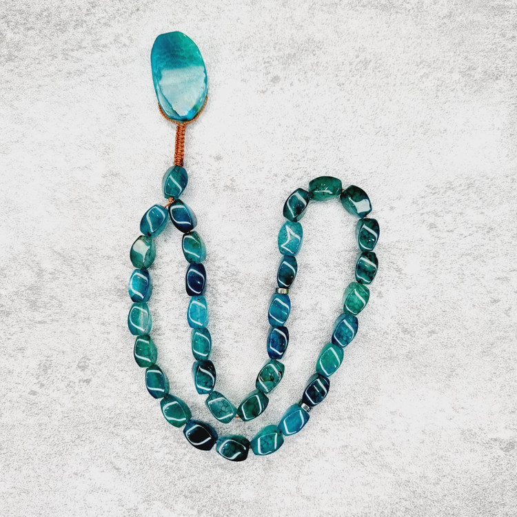 تسبیح عقیق سبز با ۳۳ مهره استوانه پیچی و شرابه اسلایس عقیق | Green Agate Tasbih 💚📿