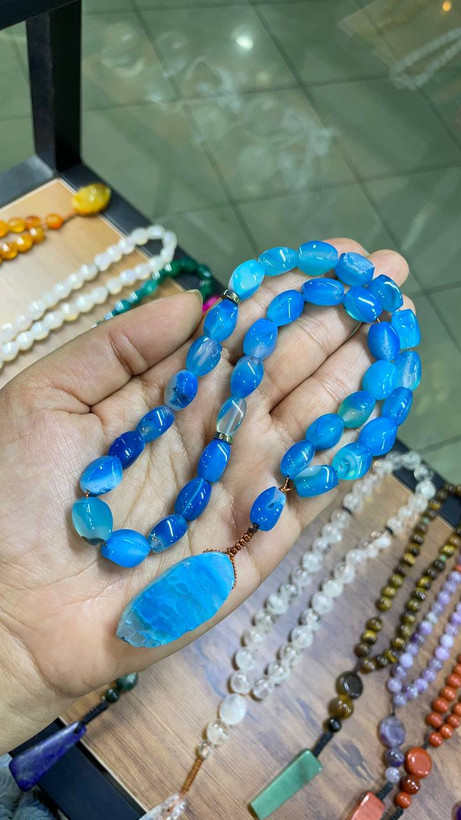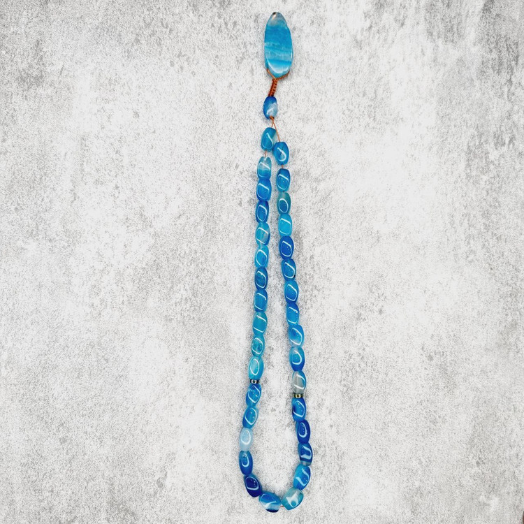 تسبیح عقیق آبی با ۳۳ مهره استوانه پیچی و شرابه اسلایس عقیق | Blue Agate Tasbih 💙📿