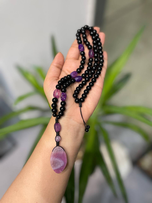 این گردنبند خاص با ترکیب اونیکس سیاه و عقیق بنفش حلیپیچی، طراحی شده تا هم از شما در برابر انرژیهای منفی محافظت کنه و هم شعلهی درونتون رو شعلهورتر کنه.