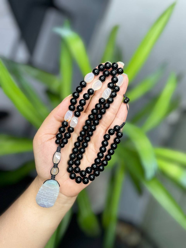 در این طراحی خاص، اونیکس سیاه در کنار عقیق سفید حلیپیچی قرار گرفته تا تعادلی بینظیر بین محافظت و پاکسازی انرژیها ایجاد کنه.