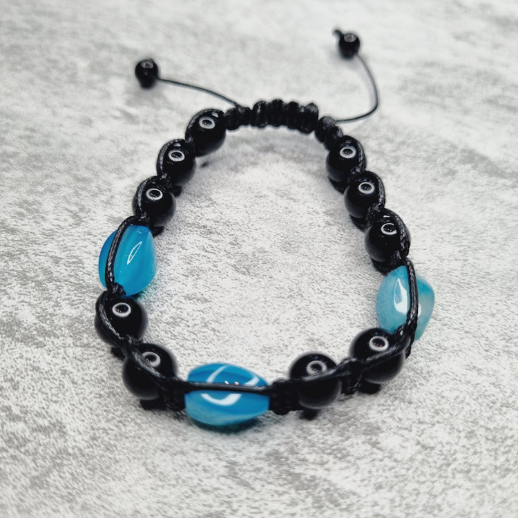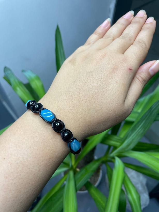 این دستبند خاص از ترکیب اونیکس سیاه و عقیق آبی حلیپیچی ساخته شده و روی بافتی از نخ چرمی محکم سوار شده که با گره آسانسوری بهراحتی روی مچ هر دستی تنظیم میشه.