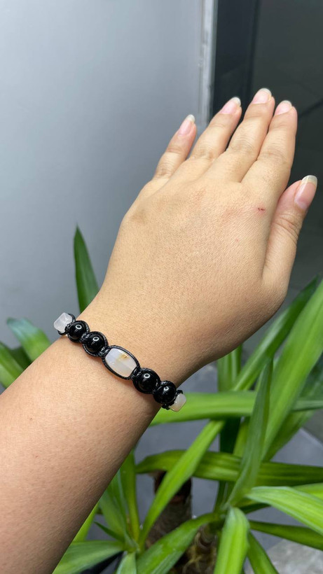 دستبند سنگ شانس با عقیق سفید و مهره اونیکس سیاه | عنصر فلز ⚪️✨