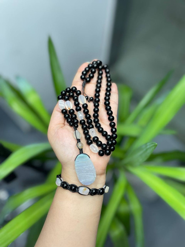 این نیمست چشمنواز از گردنبند مدالدار عقیق سفید حلیپیچی و دستبند چرمی با مهرههای اونیکس سیاه و عقیق سفید ساخته شده. ترکیبی که با عنصر فلز در هماهنگیه و بهت کمک میکنه افکارتو نظم بدی، با اراده تصمیم بگیری و در مسیر بمونی.